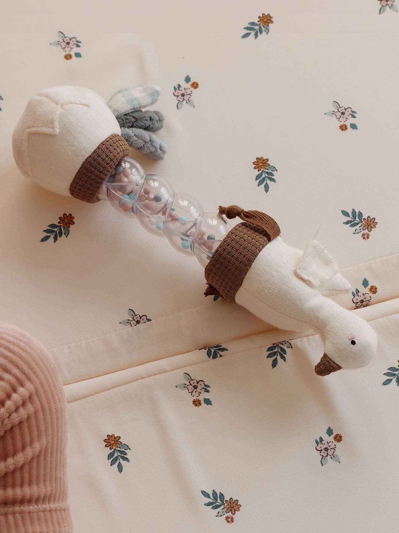 Ce joli bâton de pluie est idéal pour développer les sens de bébé avec ses petites billes qui s'écoulent lorsqu'on le retourne. La peluche oie à son extrémité ne demande qu'à être câlinée.