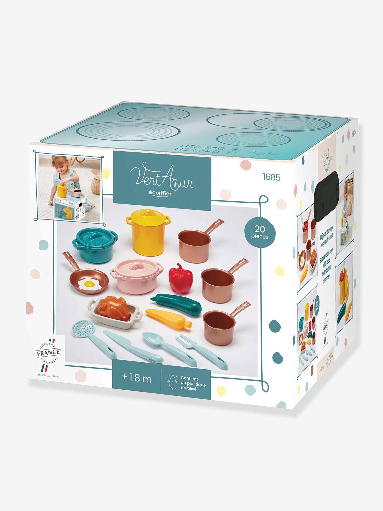 Tout le matériel de cuisine nécessaire pour mitonner de bons petits plats sont dans ce set, avec même une boîte illustrant une gazinière ! Au Fourneaux ! Ce produit de la gamme Vert Azur s’inscrit dans une démarche éco-responsable. 32 pièces.