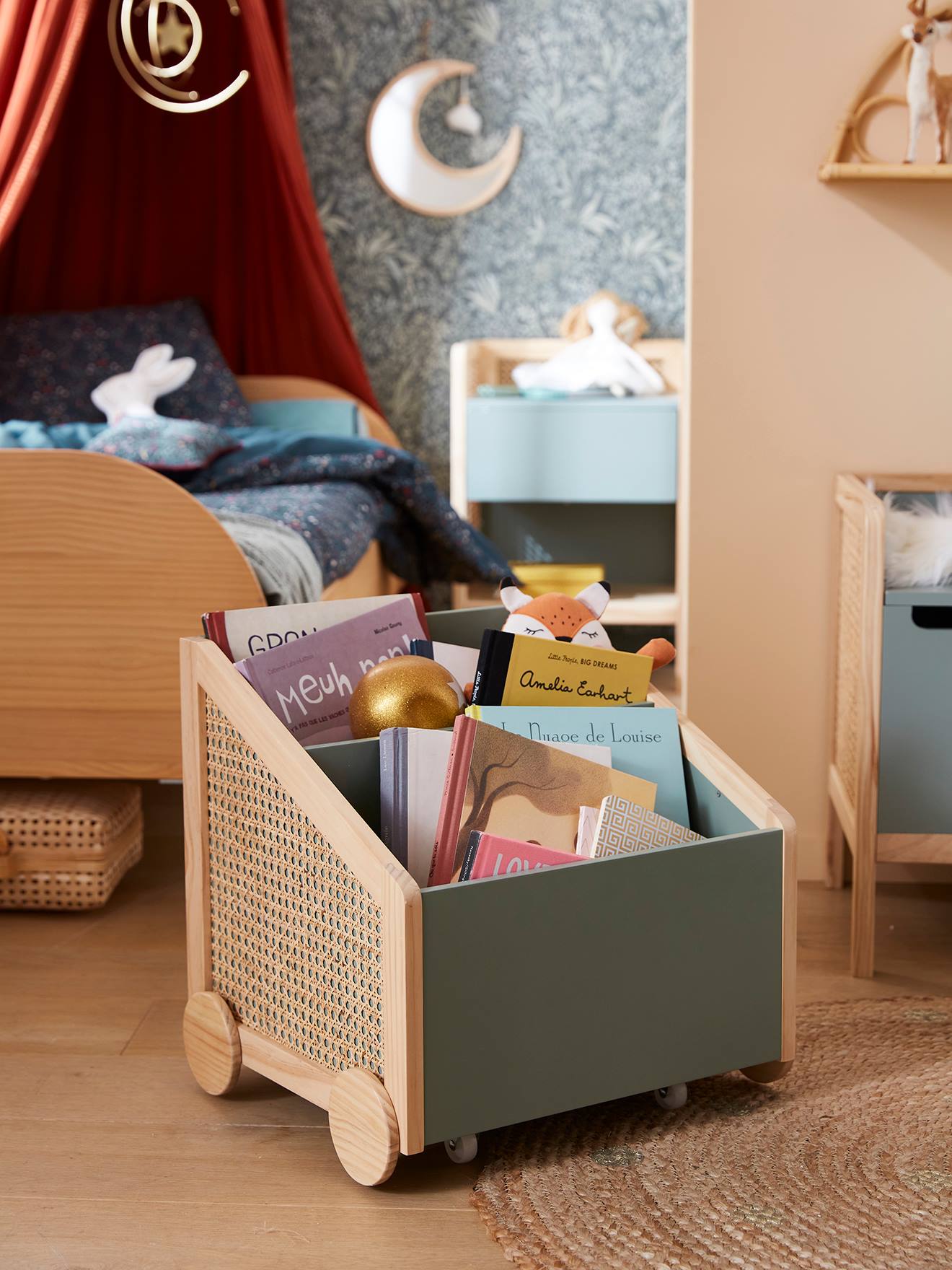 Un joli coffre idéal pour ranger les livres et les jouets. On craque pour l'association du vert, du bois et du cannage qui sublimera votre intérieur.