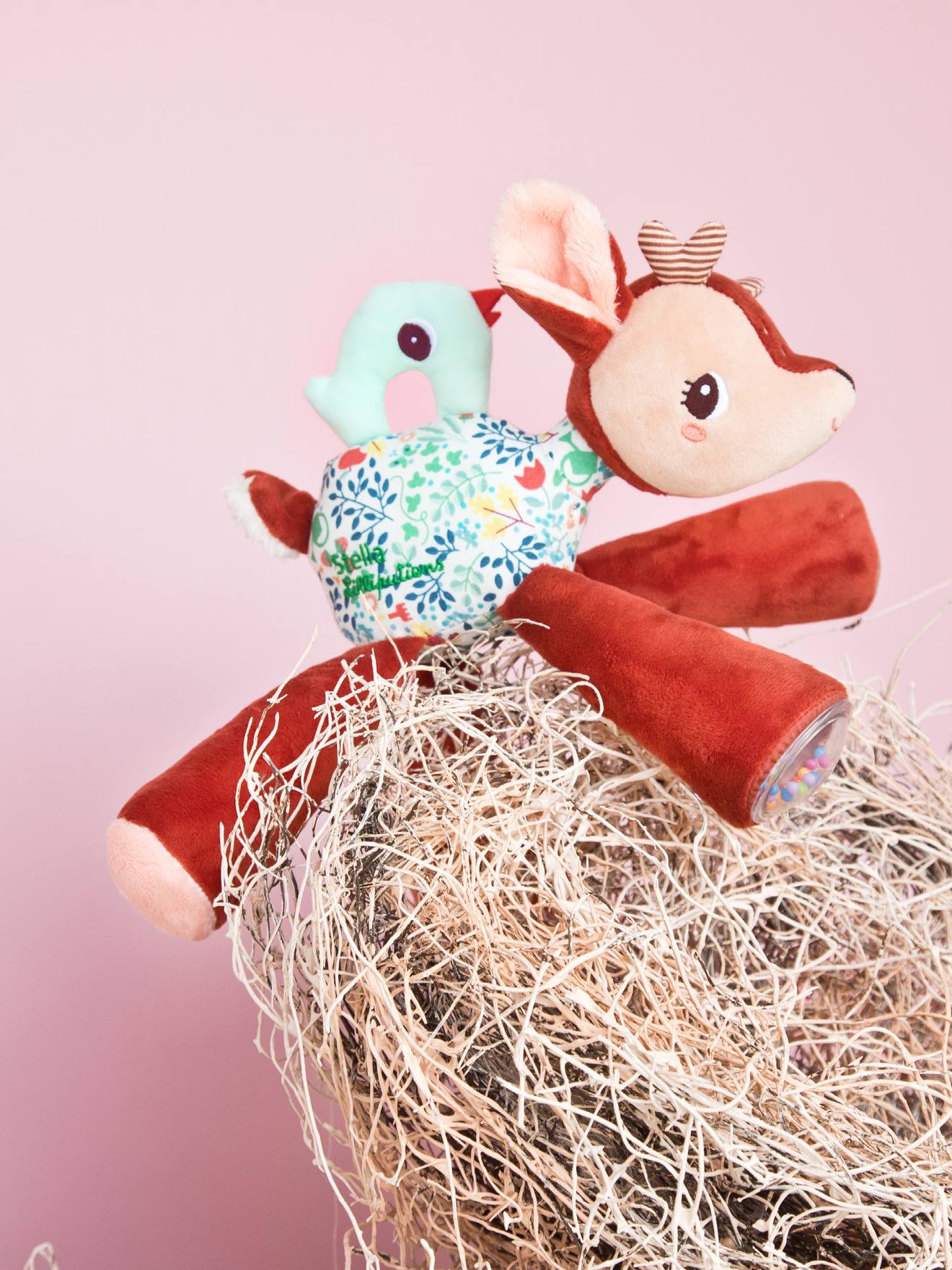 Stella, le faon, étire ses pattes pour le plus grand plaisir des petites oreilles. Crépitement, hochet, tintement... et quand on appuie sur son ventre, le petit oiseau gazouille !