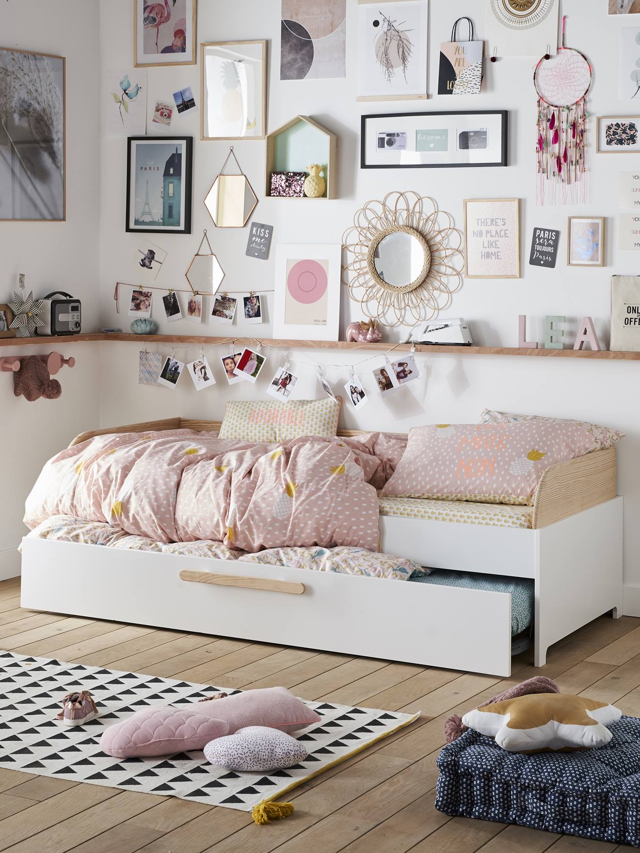 Un lit peut en cacher un autre... Ce lit gigogne permet d'accueillir un(e) invité(e) surprise ou un(e) copain(e) pour une pyjama party. Ce lit hyper malin cache bien son jeu : il passe de 1 à 2 couchages en un tour de main, grâce au tiroir-lit d'appoint escamotable. Solution gain de place au design actuel, ce lit gigogne trouvera parfaitement sa place dans la chambre de vos enfants. Livré avec sommier.