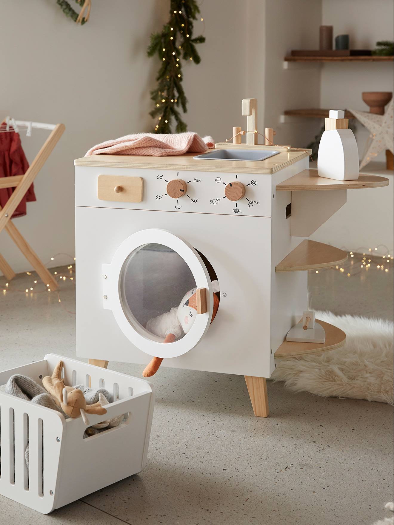 Les enfants aiment tellement imiter les grands ! Avec cette super machine à laver et à repasser, ils vont être comblés ! Toute équipée, la machine possède 3 tablettes, un évier, un hublot qui s'ouvre, un compartiment à lessive et de petits boutons pour la programmation. Elle est également livrée avec un fer à repasser, un bidon de lessive et un adorable panier à linge. Un magnifique jouet en bois qui amuse et décore à la fois !
