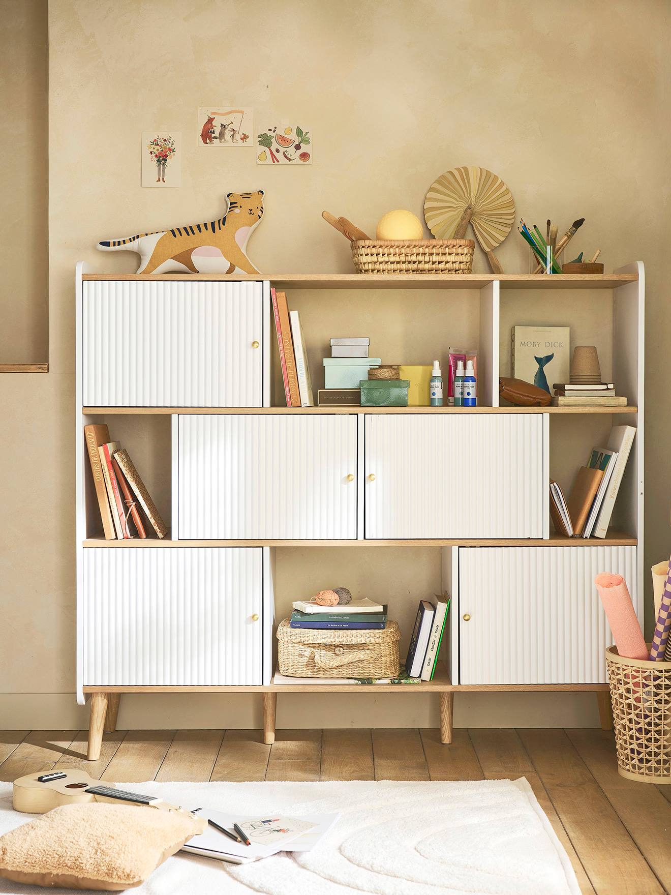 Un meuble bibliothèque qui allie design et praticité. Avec ses espaces ouverts et fermés, il permet de ranger et d'exposer les livres et les objets préférés de votre enfant. La poignée dorée et les portes rainurées ajoute une touche d'élégance à ce meuble.