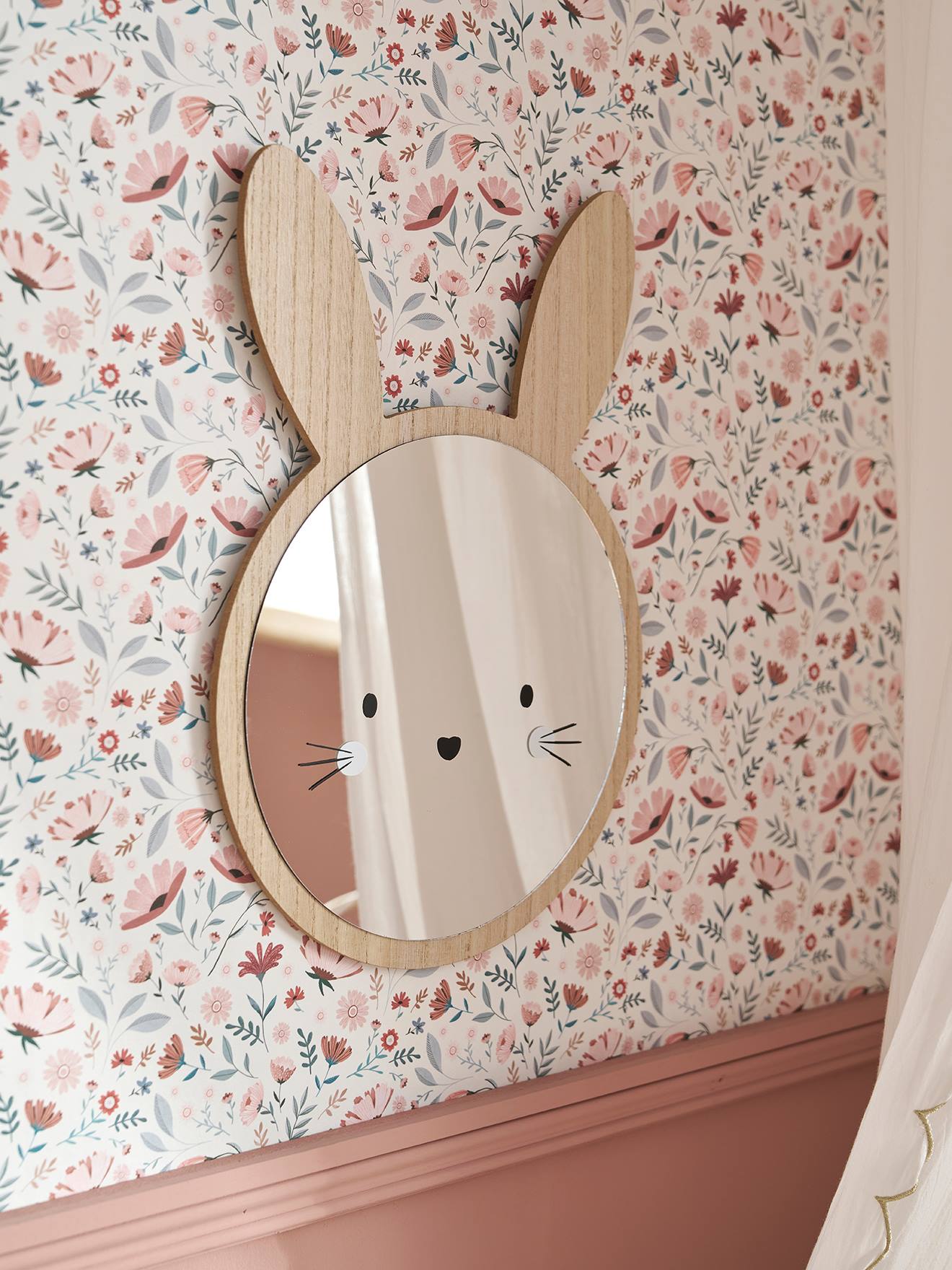 Tellement adorable, ce miroir en bois et le visage de lapin qui couvre le mur de tendresse !