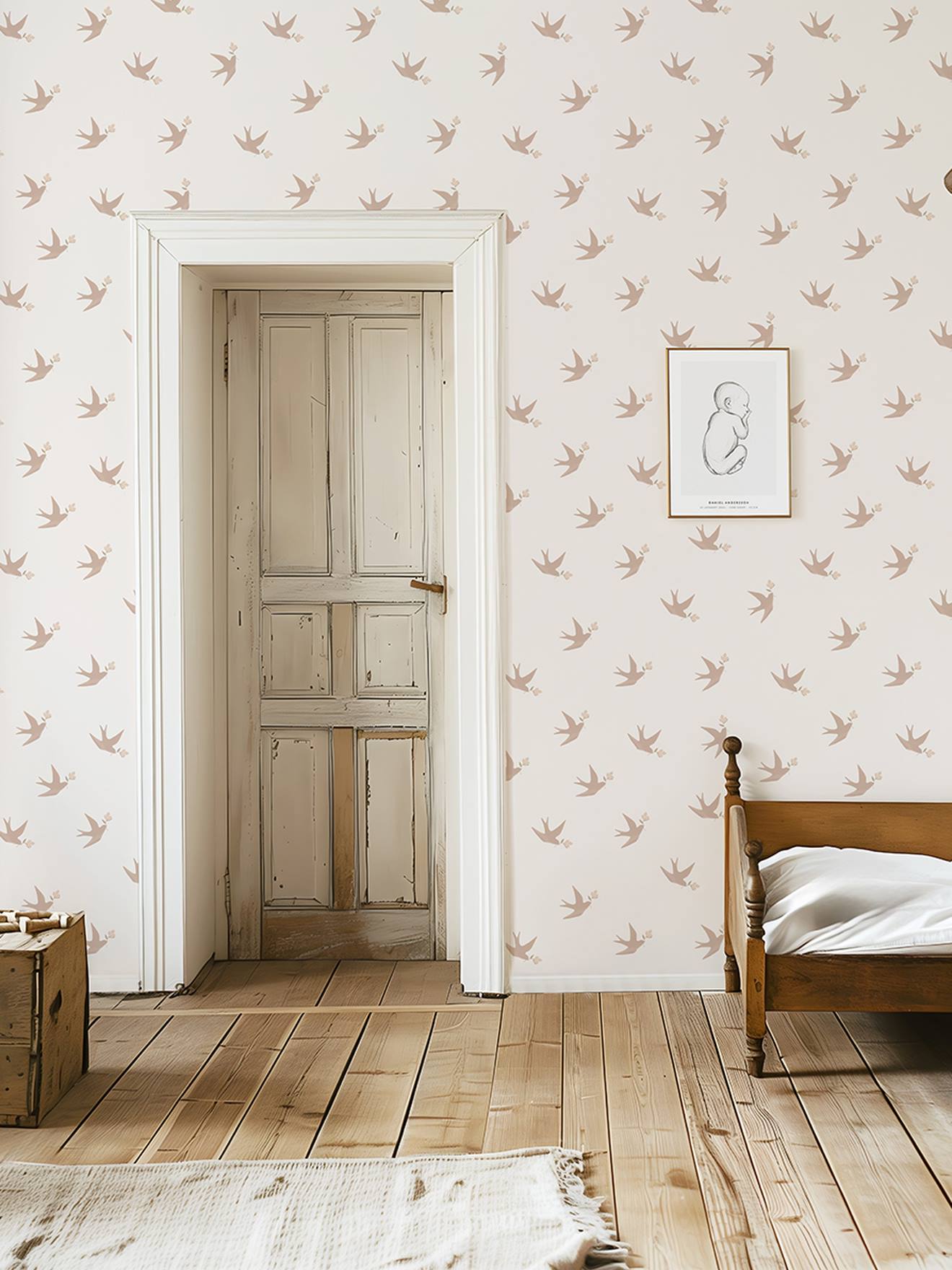 Transformez la chambre en havre de paix avec ce papier peint motif hirondelle rose blush. Ce design élégant et poétique crée un air de renouveau printanier. La palette de roses monochromes se marie parfaitement avec le mobilier rustique, associant rose pâle et bois pour une élégance intemporelle et sans effort.
