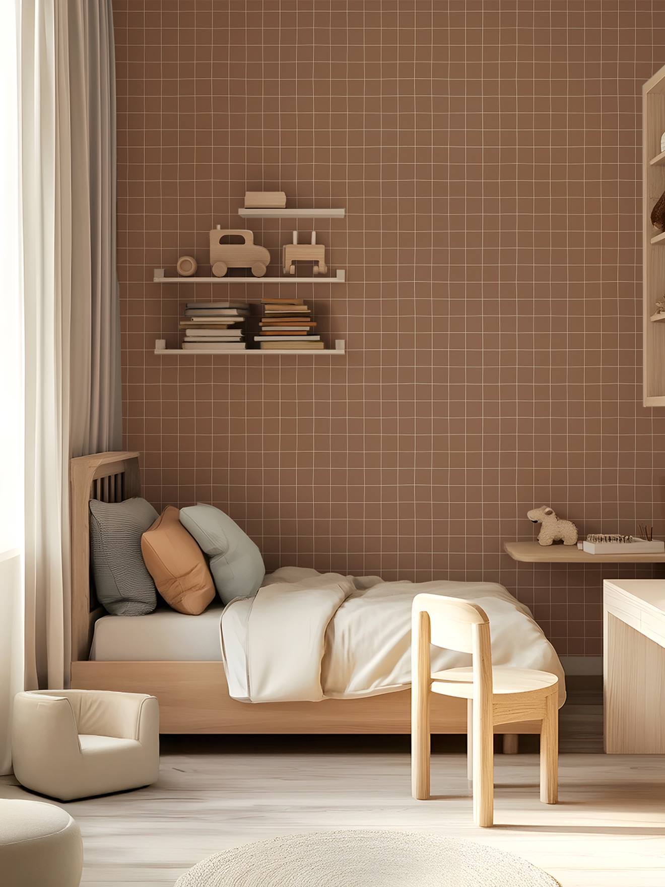 Transformez votre espace avec ce papier peint à carreaux caramel et lignes claires, alliant élégance sophistiquée et modernité. Parfait pour les chambres d'enfants, il apporte une touche de surprise et de ravissement. Les teintes chaudes discrètes créent une atmosphère chaleureuse et raffinée. Optez pour ce papier peint pour une décoration subtile et élégante, parfaite pour toute pièce désirant allier caractère et modernité.