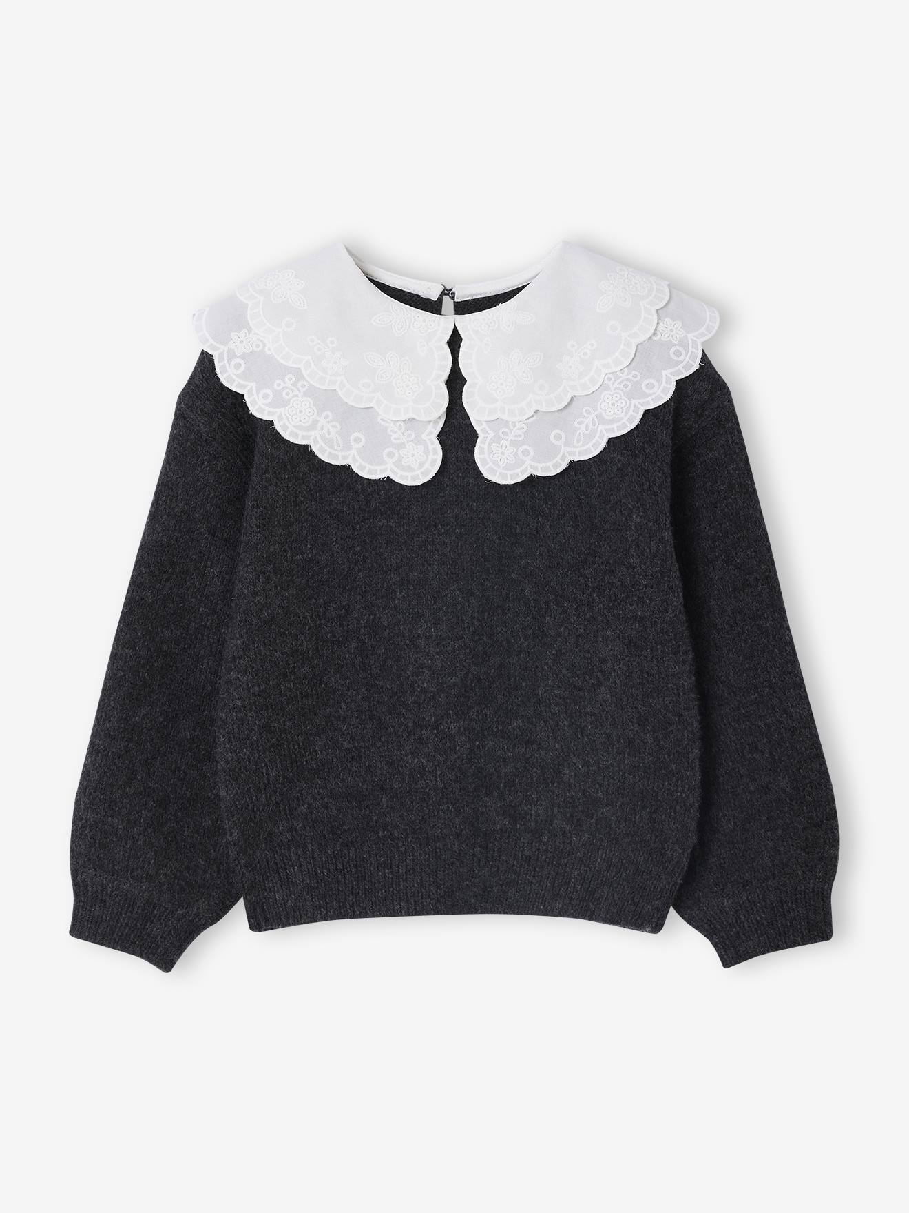 Accueil>Vêtement fille enfant>Pull, gilet, sweat>Pull fille>Pull fille double col brodé maille mousseuse - anthracite