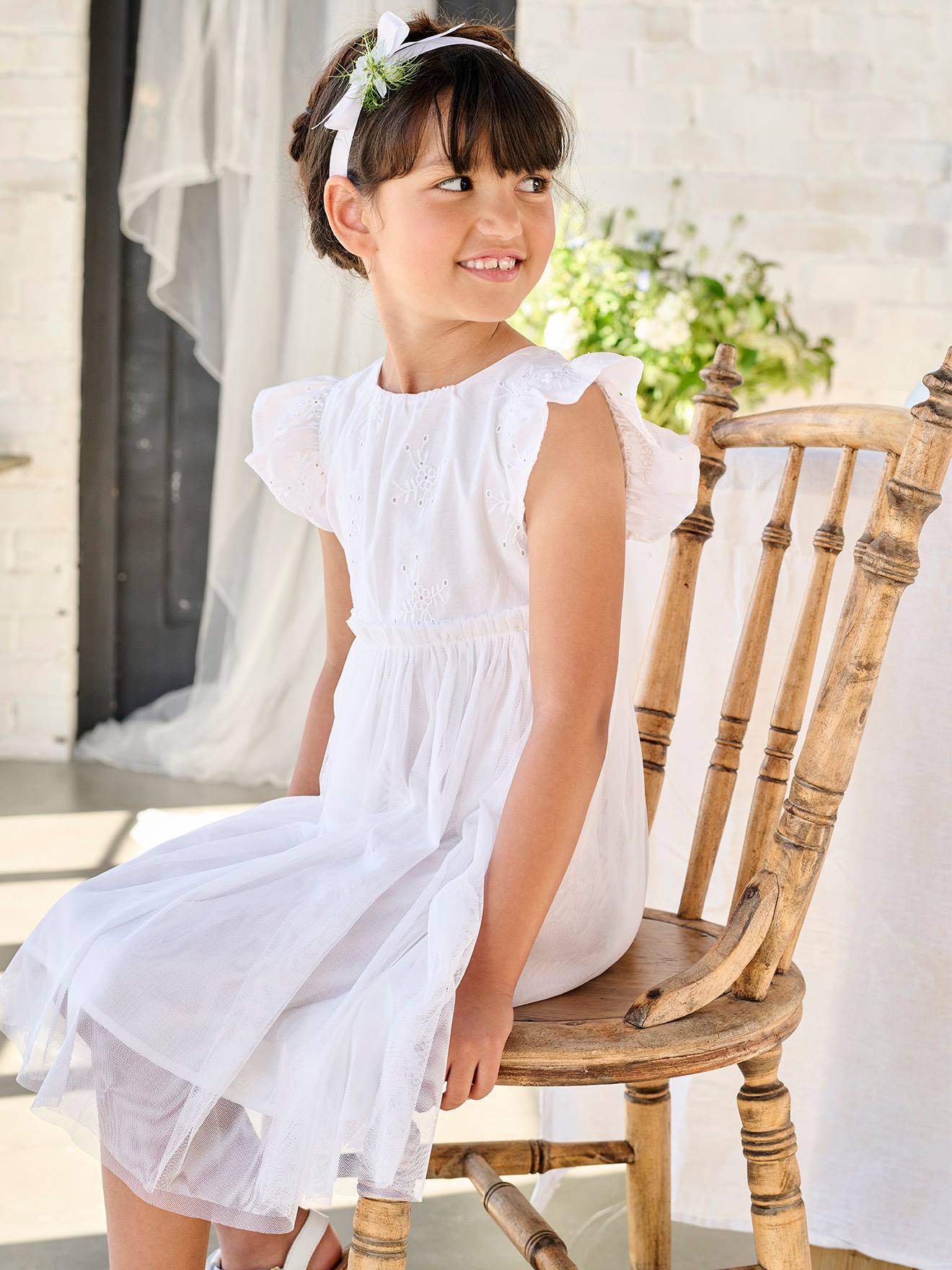 Robe cérémonie bi-matière en broderie anglaise et tulle fille - blanc