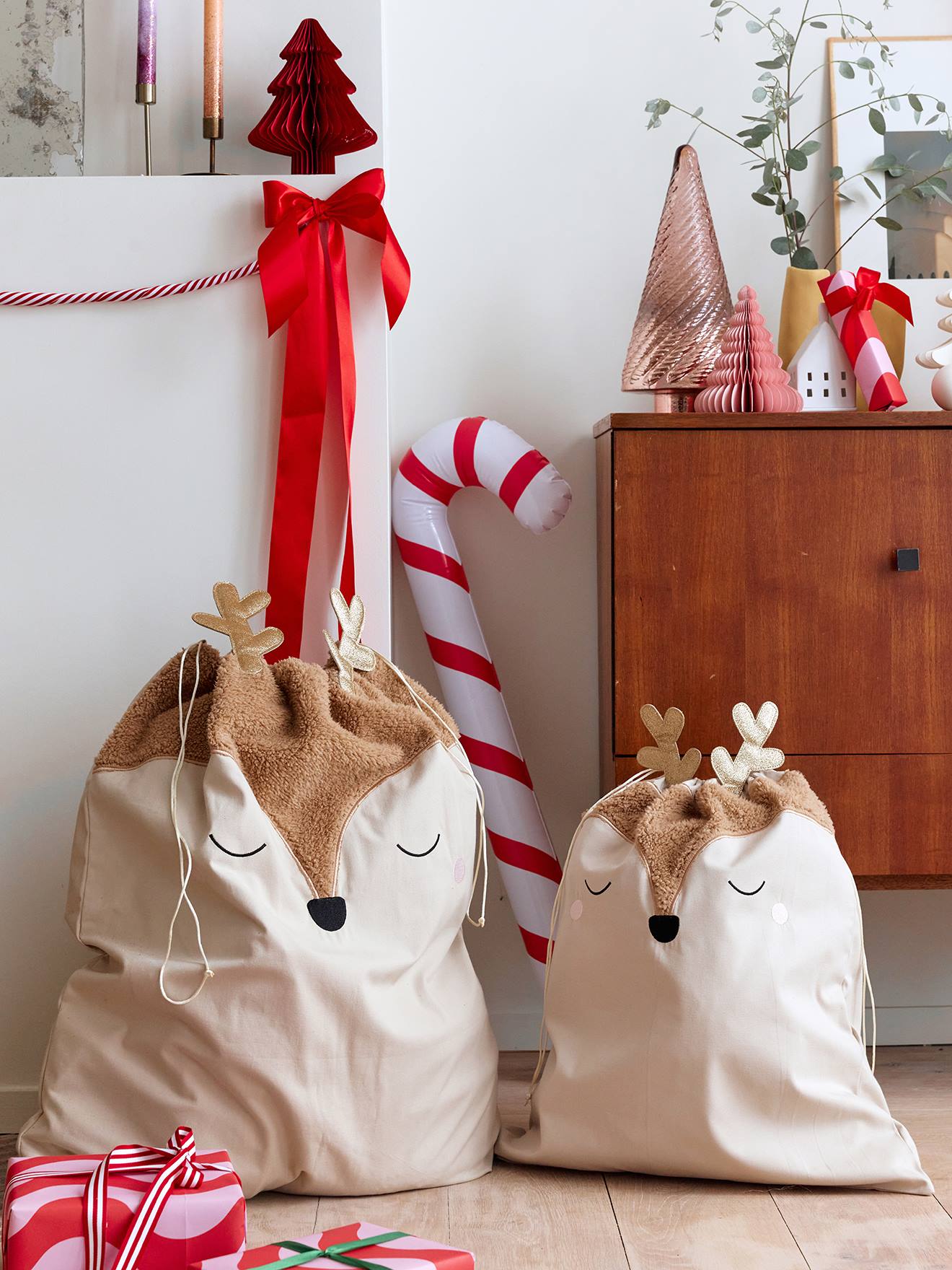Un sac hotte en forme de renne pour transporter les cadeaux de Noël ! Avec son sherpa tout doux et ses cornes en lurex doré, il est parfait pour créer une ambiance festive et chaleureuse.