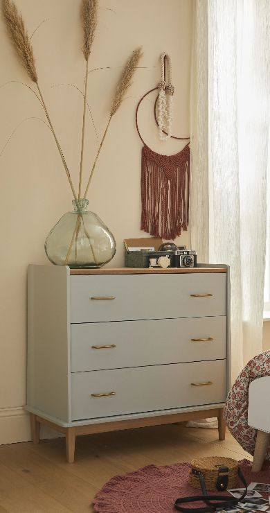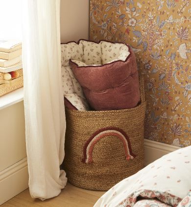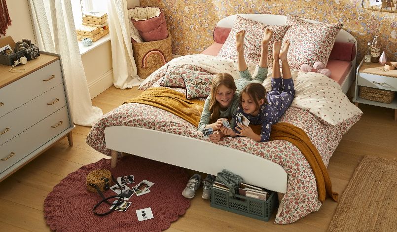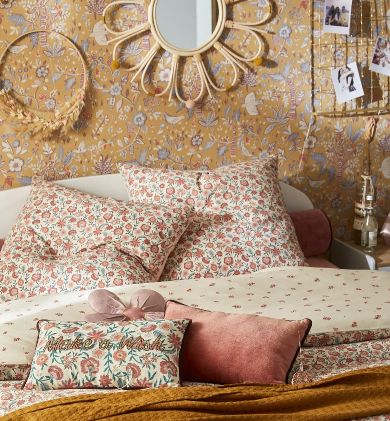 Lit double, table de chevet et commode font un come – back dans les seventies avec un mix de matière textile et naturelle ! Miroir, pêle-mêle et petites décos donnent du caractère à la chambre fleurie des ados !