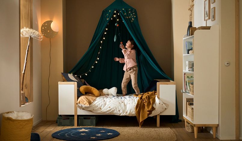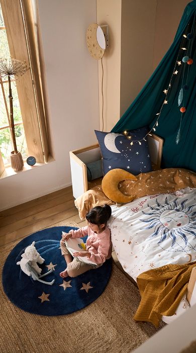 Coussin lune, parure de lit solaire, tapis étoile filante… Fermez les yeux et faites un vœu : dans l’ambiance céleste il suffit de croire en ses rêves pour qu’ils se réalisent !