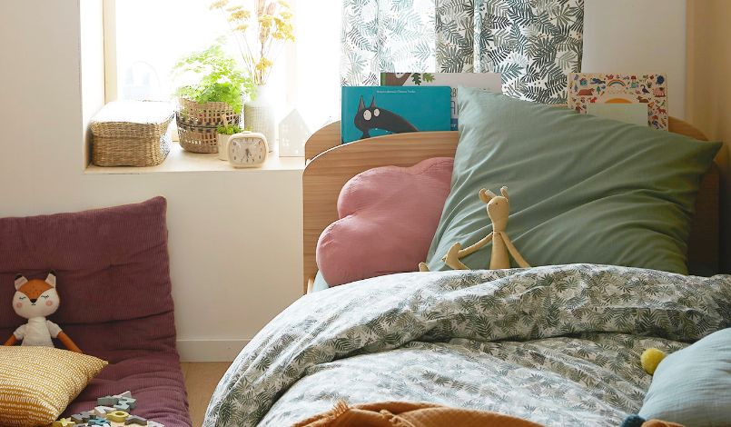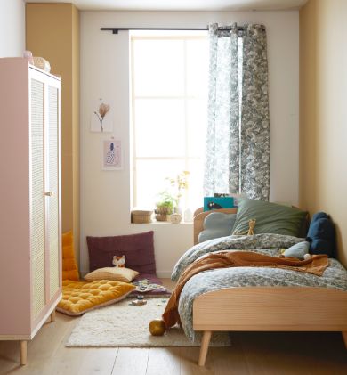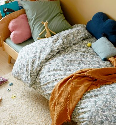 En route pour la tendance jungle revisitée par nos stylistes! Vert d’eau et vert kaki plantent le décor avec de jolis motifs végétaux sur les rideaux et parures de draps des petits explorateurs !