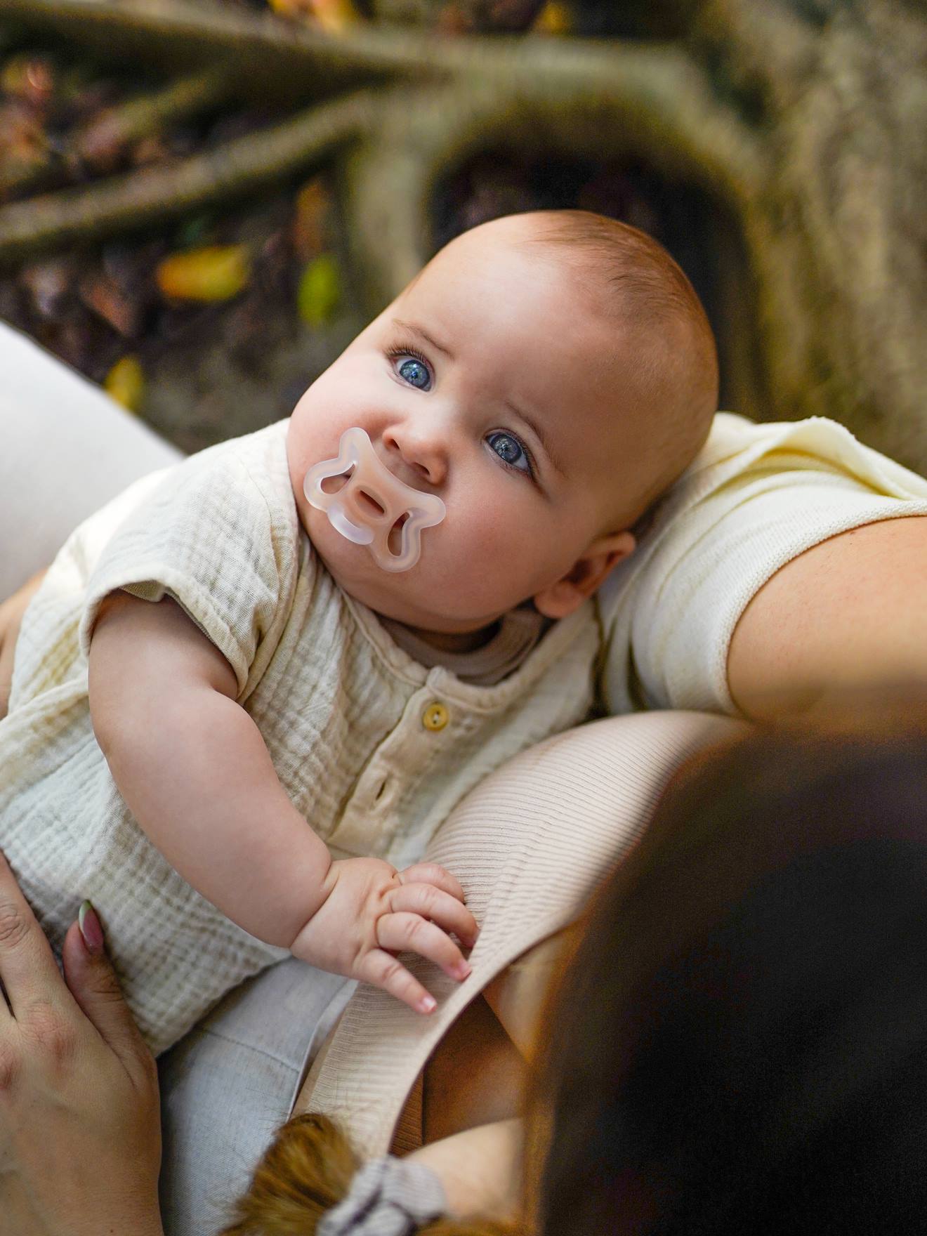 • Base fine, pour permettre au tout-petit de fermer la bouche quasi complètement, et large, pour réduire l’interférence générée entre tétine et incisives centrales et mieux distribuer la pression exercée sur les gencives et les dents