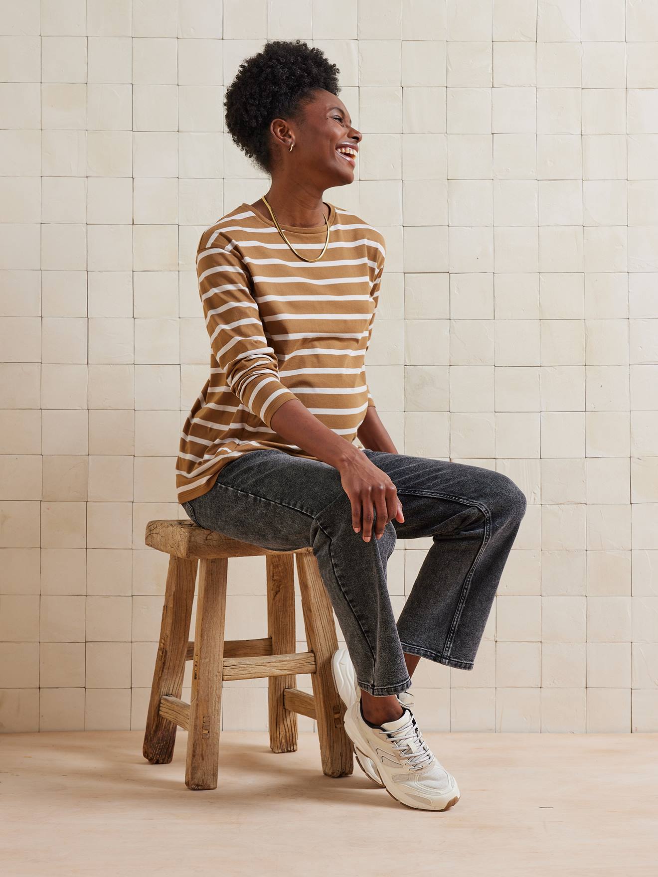 Moderne, le T-shirt suit la tendance nautique avec ses rayures. Pratique, il est zippé côté et permet d'allaiter en toute facilité.