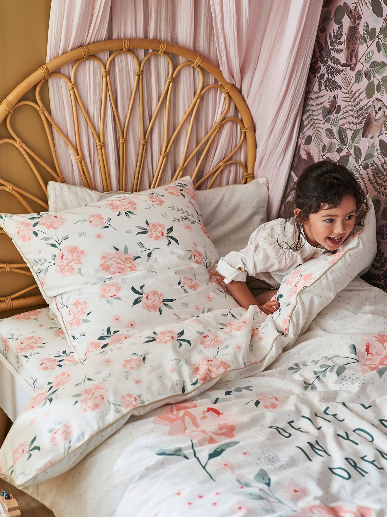 On craque pour cette belle tête de lit et sa forme fleur ! Sa matière rotin naturelle apporte une touche rétro à la déco de la chambre d'enfant.