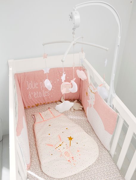 Ce qu'il faut savoir...Détails & MatièreD’un coup de baguette magique, l’adorable lapin de ce tour de lit fait jaillir une pluie d’étoiles sur le sommeil de bébé.