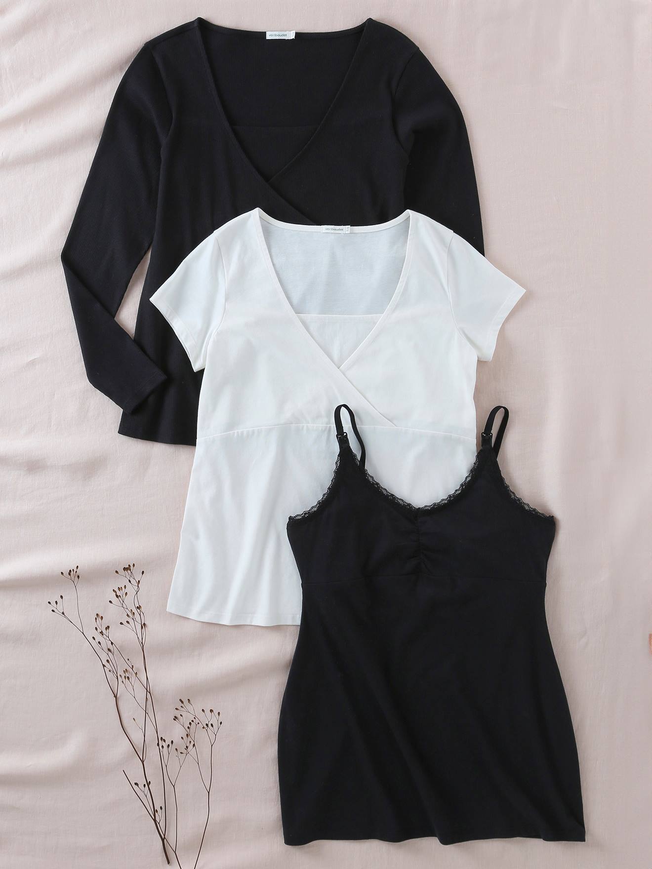 Deze speciale aanstaande moederset is een geweldig idee. Het bestaat uit 3 T-shirts: 1 wikkel-T-shirt met lange mouwen, 1 wikkel-T-shirt met korte mouwen en 1 onderhemdje met dunne bandjes en kanten afwerking voor een nog vrouwelijkere look! Ze zijn gemaakt van zacht en comfortabel tricot en maken je het leven gemakkelijk tijdens de zwangerschap, en ook als je borstvoeding wilt geven!
