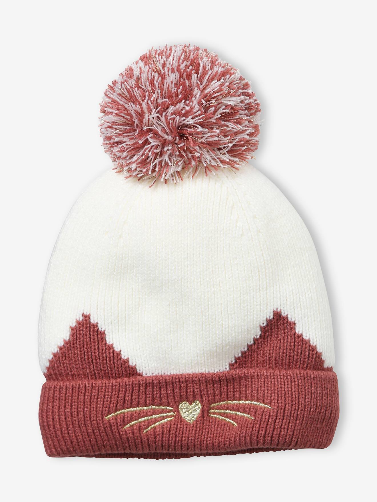 • Geborduurde muts kat in geribd breisel donkerroze - vertbaudet enfant