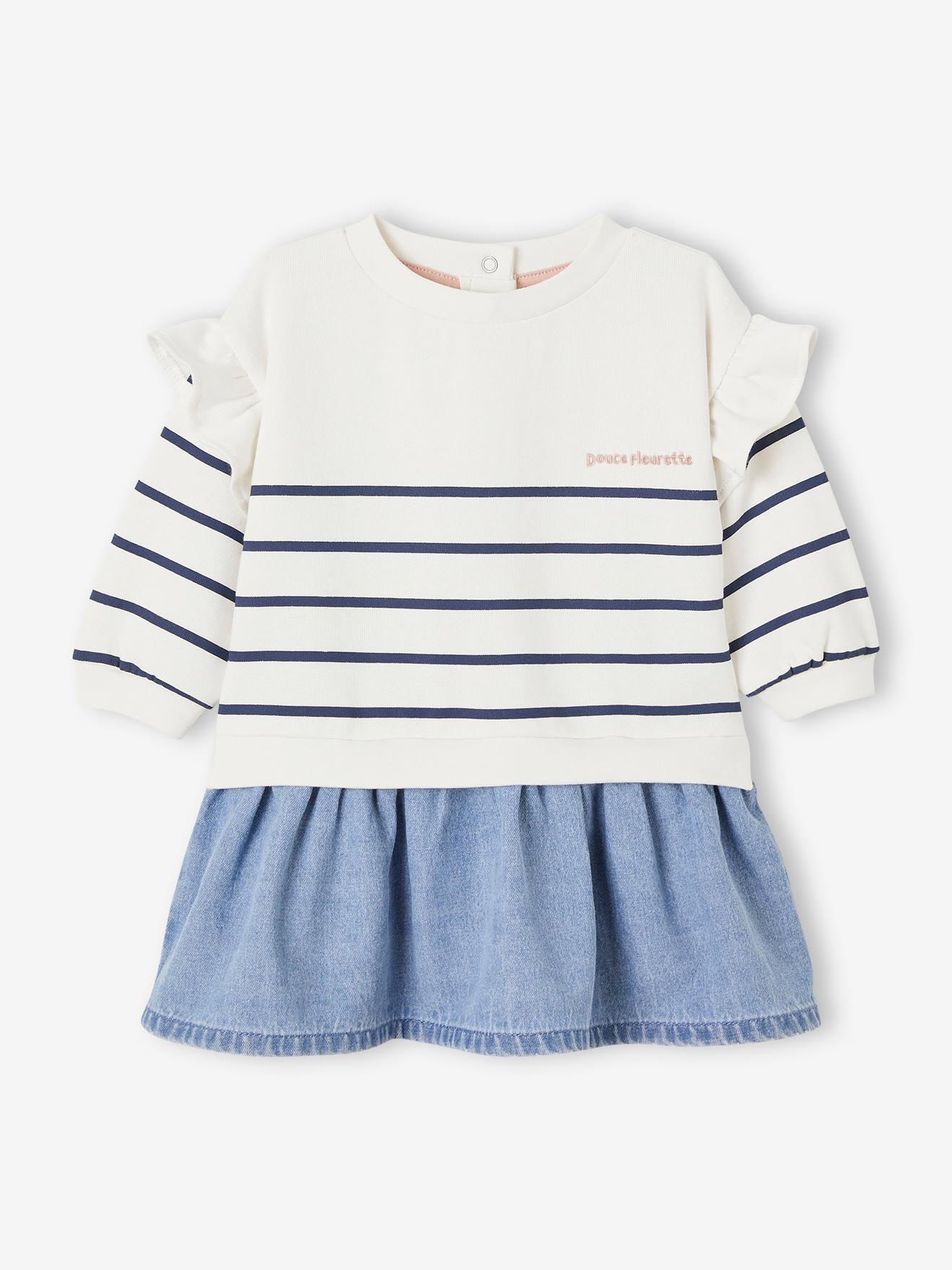 Een supercomfortabele jurk van twee materialen die fleece en denim combineert voor een 2-in-1 effect. De gestreepte top in maritieme stijl is gemaakt van fleece en de onderrok van lichtgewicht denim. Wij houden van de stijl van deze jurk, met zijn mix van materialen en mouwen met ruches. Ideaal voor dagelijks gebruik.