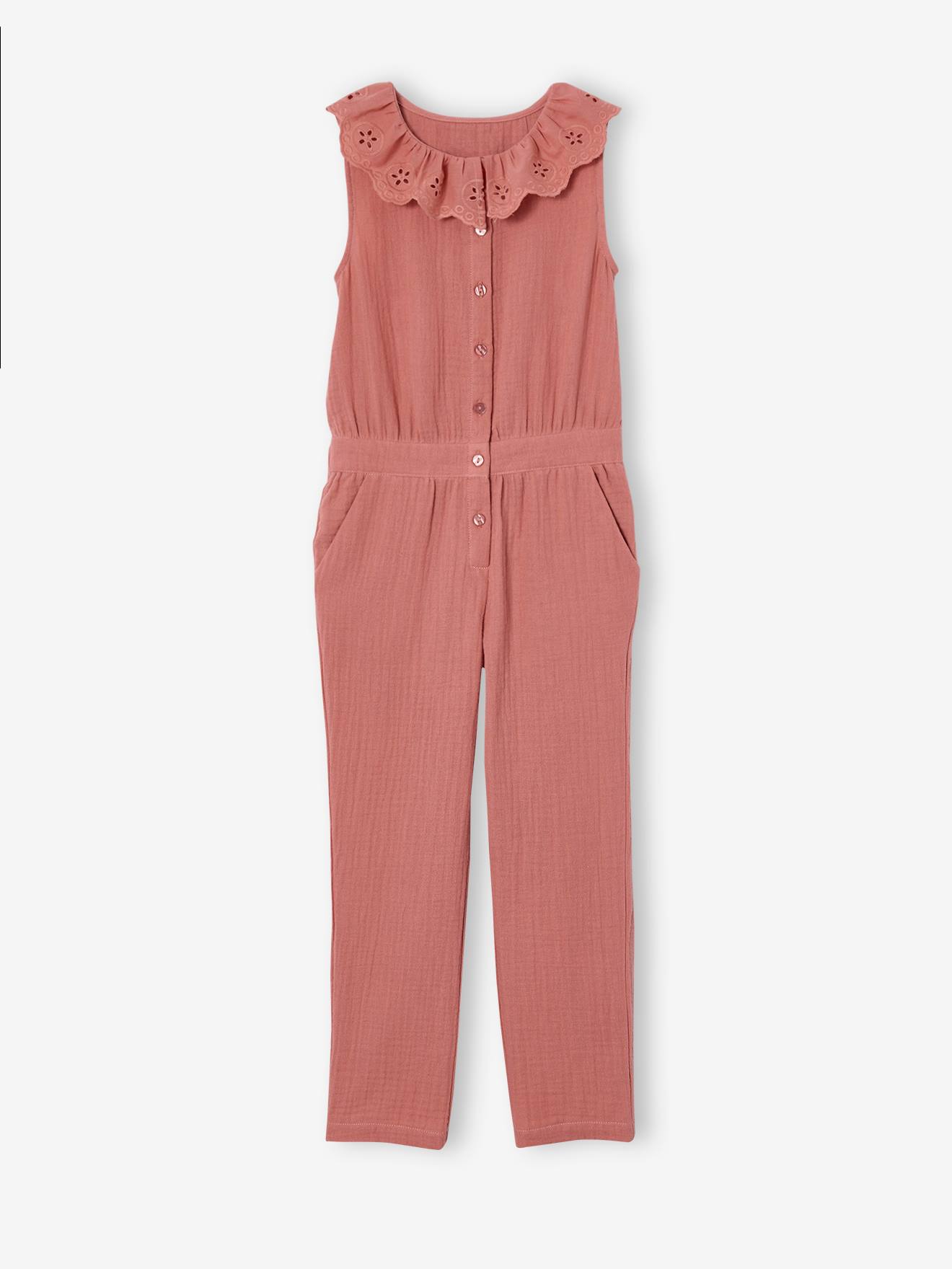 Home>Meisjeskleding>Salopet meisje, jumpsuit>Lange babytuinbroek van katoenen gaas met kraag van Engels borduurwerk - oudroze