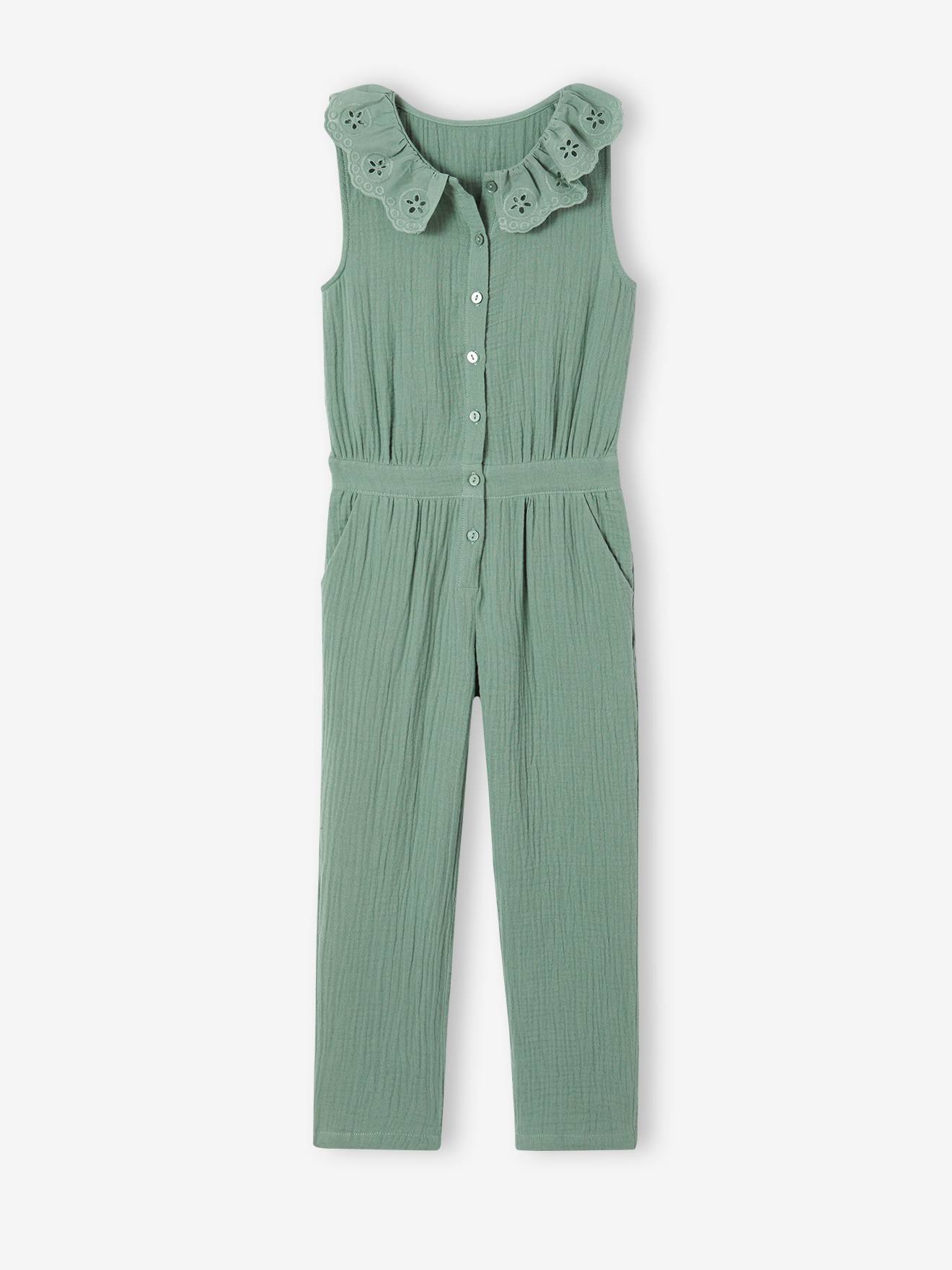 Home>Meisjeskleding>Salopet meisje, jumpsuit>Lange babytuinbroek van katoenen gaas met kraag van Engels borduurwerk - saliegroen