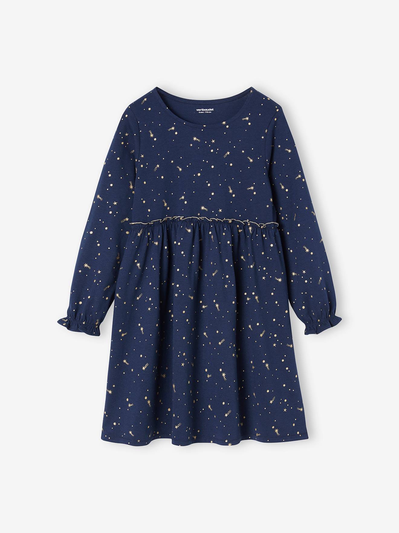 Meisjesfeestjurk met glanzende sterrenprint - marineblauw