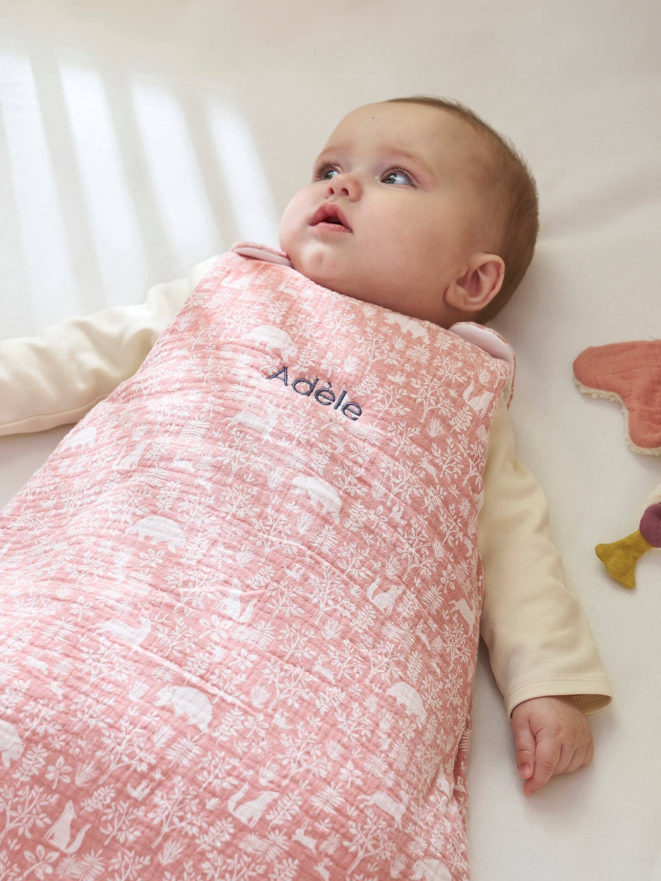 • Mouwloze slaapzak van katoengaas personaliseerbaar IN HET BOS oudroze+saliegroen - vertbaudet enfant