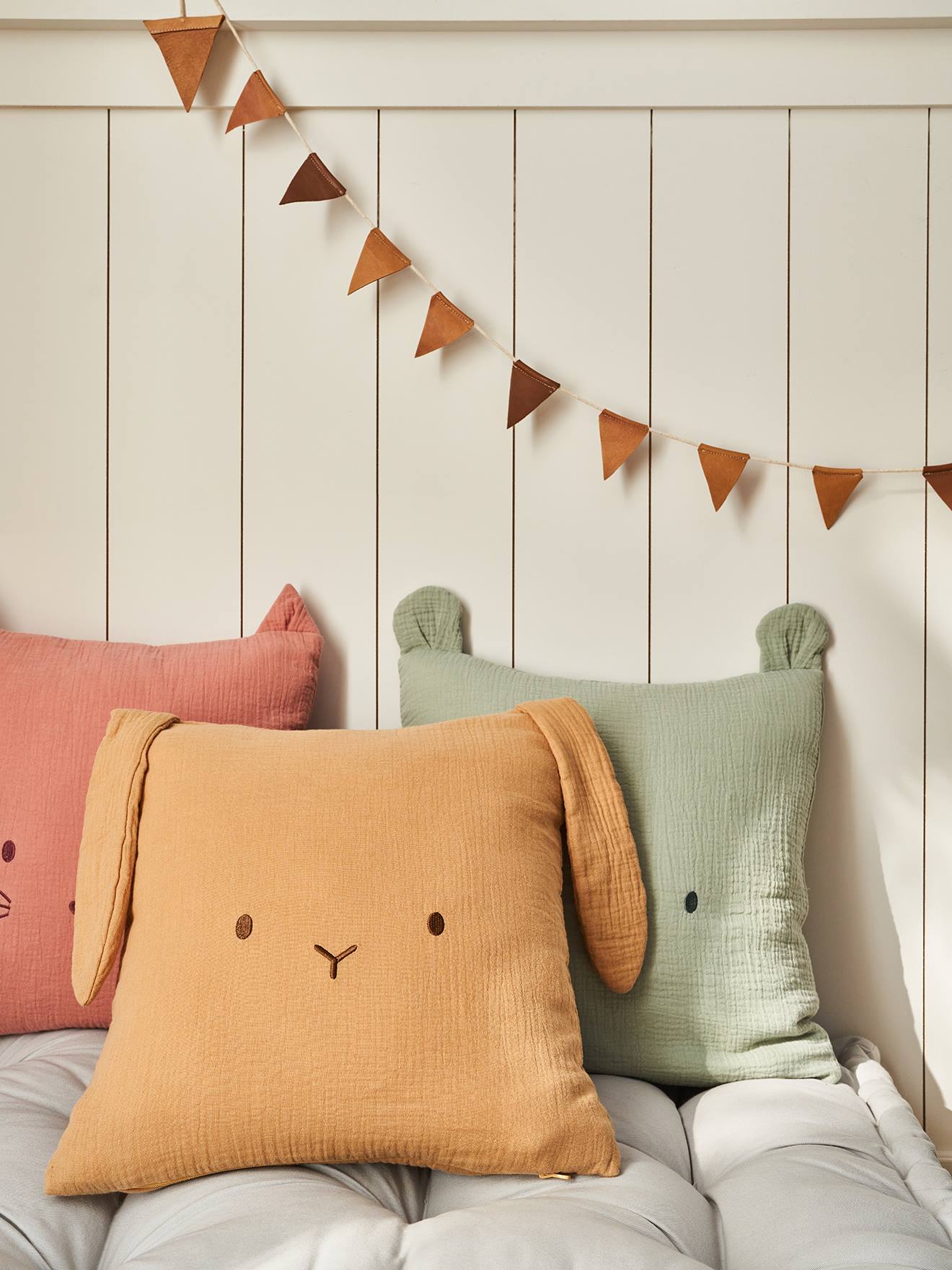 Het kussen staat symbool voor knus comfort en is versierd met schattige oortjes en een geborduurd gezichtje voor maximale tederheid! Het is verkrijgbaar in verschillende kleuren, dus je kunt er alleen mee spelen of je huis opfleuren door het aan de collectie toe te voegen.