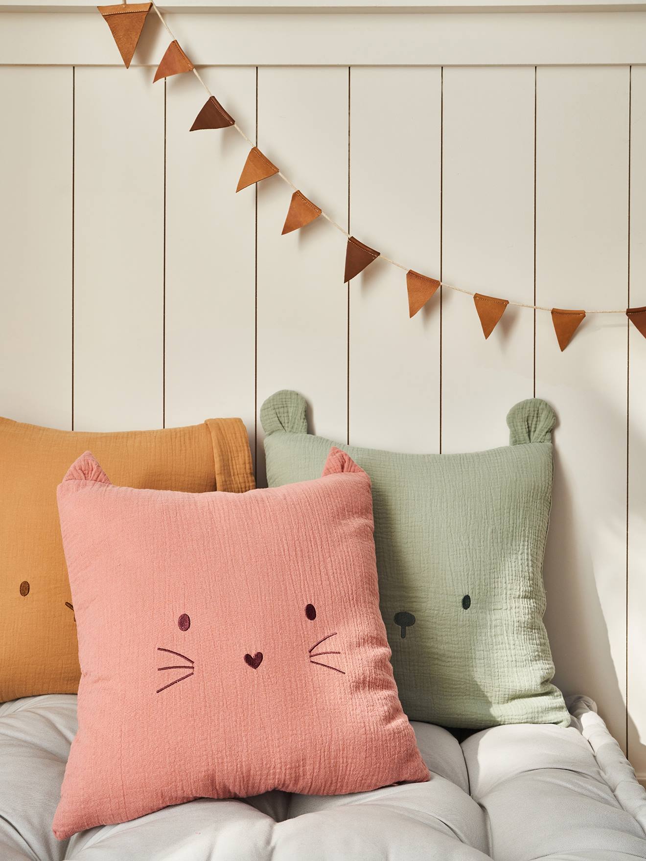 Het kussen staat symbool voor knus comfort en is versierd met schattige oortjes en een geborduurd gezichtje voor maximale tederheid! Het is verkrijgbaar in verschillende kleuren, dus je kunt er alleen mee spelen of je huis opfleuren door het aan de collectie toe te voegen.