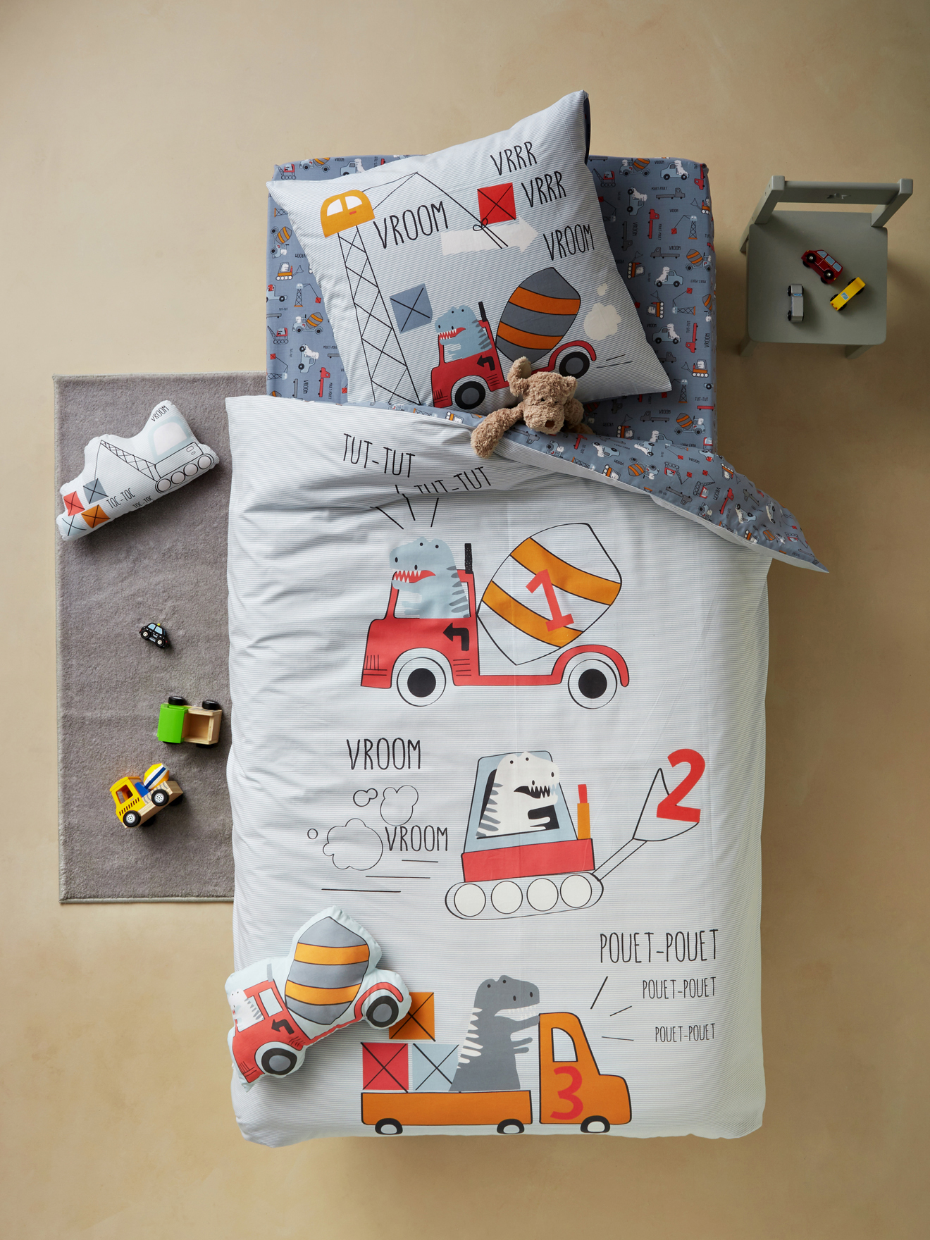 Wat u moet weten...Beschrijving & materiaalTuut-tuut! Ping-ping! Op dit beddengoed voor kinderen vind je heel wat werktuigen terug! Deze set bestaat uit een dekbedovertrek met daarop 3 wagens die door dino's bestuurd worden en een hoeslaken, je kan kan er dan ook zeker van zijn dat hij kan genieten van een mooie kamer en coole dromen!