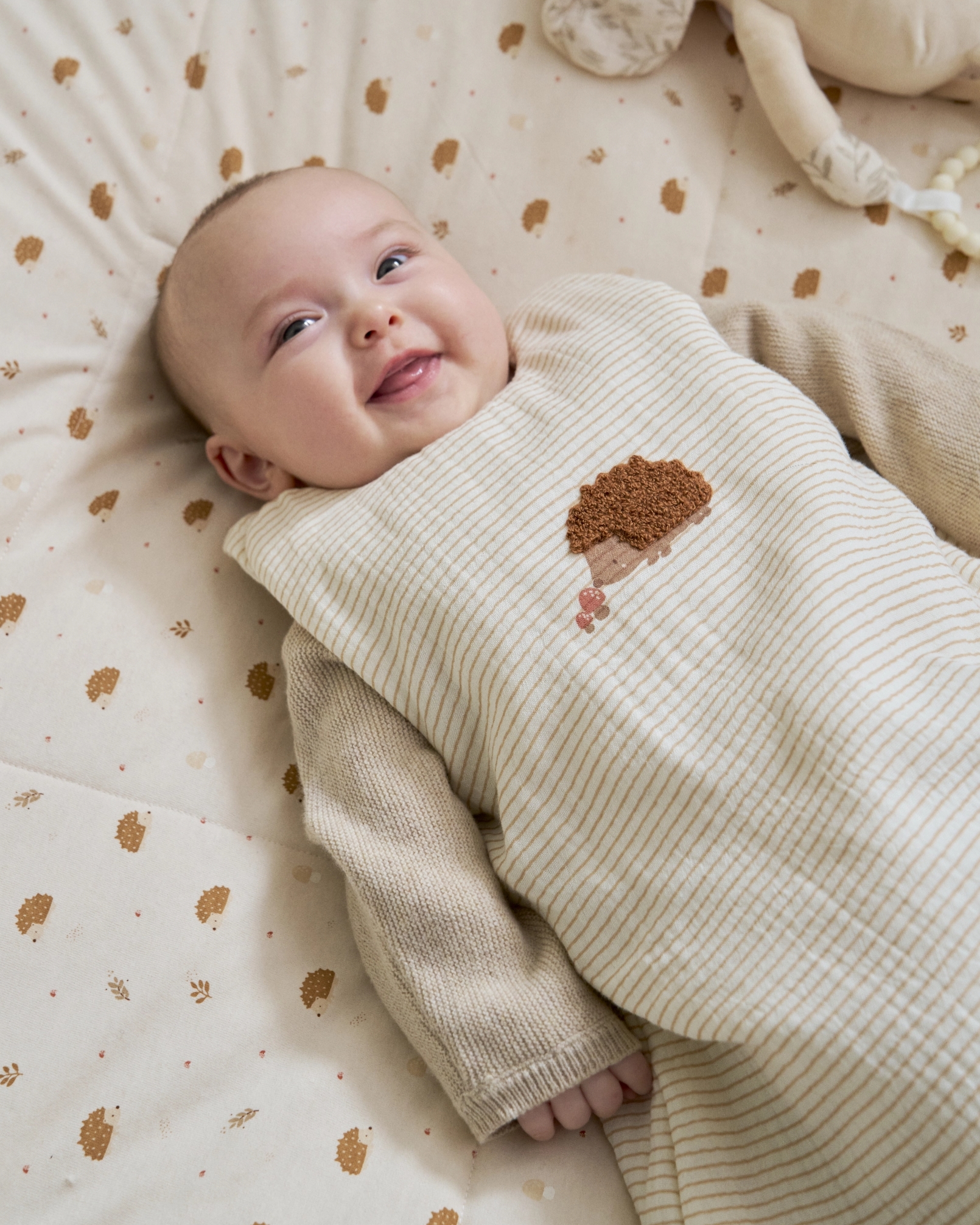 Een universum vol zachtheid, tussen tedere bladeren en natuurlijke tinten. Een zachte trappelzak, een rustgevende mobiel en knusse details creëren een geruststellende cocon van comfort, ideaal voor de eerste dagen van uw baby!