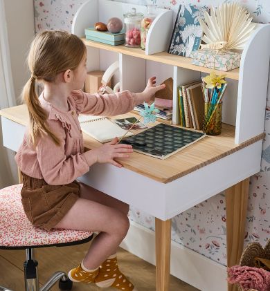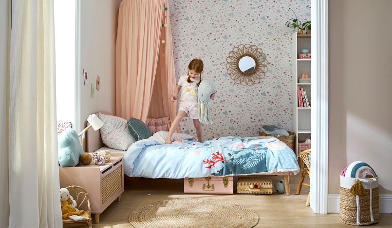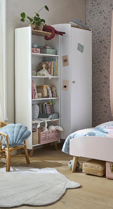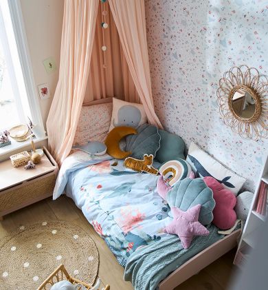 Schelpjes, zeesterren en zeedieren passen perfect bij de blauwe en roze tinten van de kinderkamer… Je kleine matroos zal genieten van de knusse oceaansfeer. De elegante meubels van rotan en het tapijtje van jute geven de kamer een warme uitstraling!