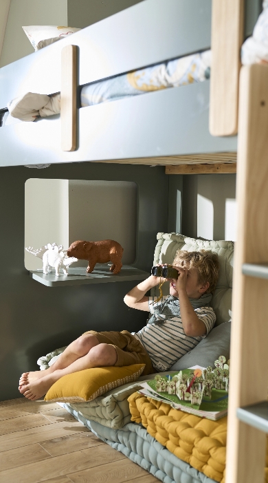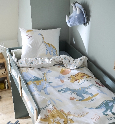 Op de muur, op de grond, in het bed ... Dino’s veroveren de kinderkamer! In combinatie met natuurlijke kleuren die doen denken aan de jungle, ontstaat een sfeer om in weg te dromen en onvergetelijke avonturen te beleven!