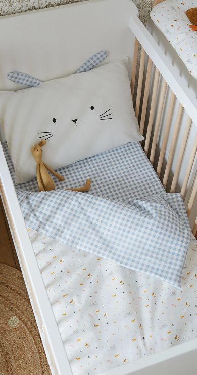 Tapijtjes, trappelzakken, aankleedkussens… De dieren van de boerderij brengen leven in de babykamer! Het katoengaas en de vichyruitjes passen mooi bij de houten en witte meubels, die de kamer een warme en natuurlijke uitstraling geven!