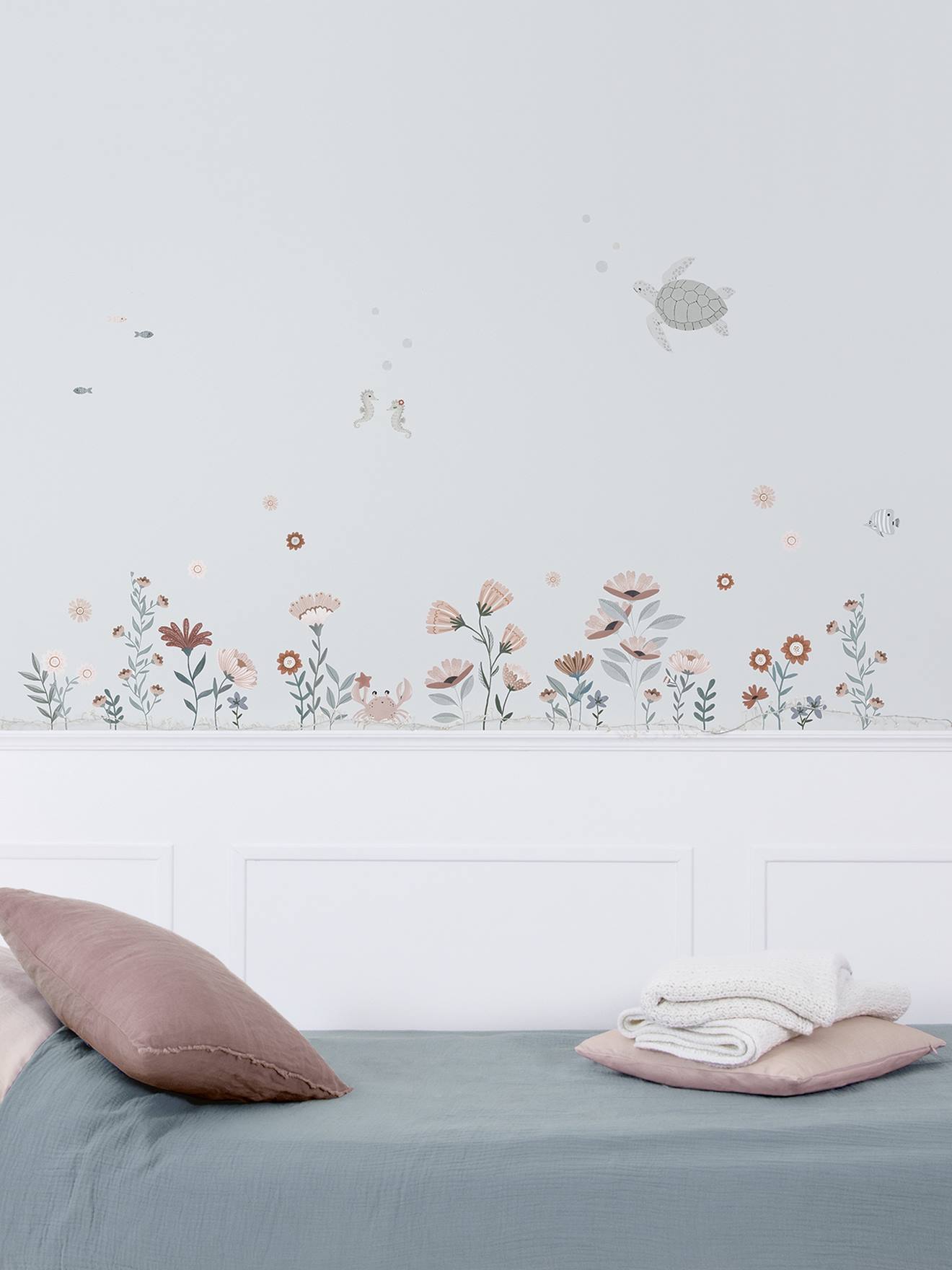 Dankzij de stickers met oceaandieren kunnen je kinderen zich onderdompelen in een zachte en poëtische wereld. Versier de muren van de kinderkamer zoals jij dat wilt met deze mooie zeebloemen, vissen, krabben, schildpadden en andere onderwaterdieren.