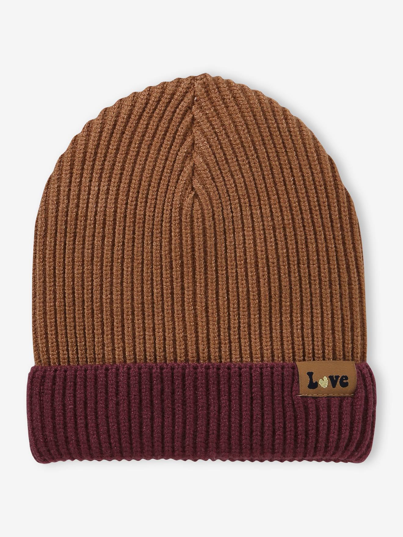 Tweekleurige gebreide muts voor meisjes - kaneel
