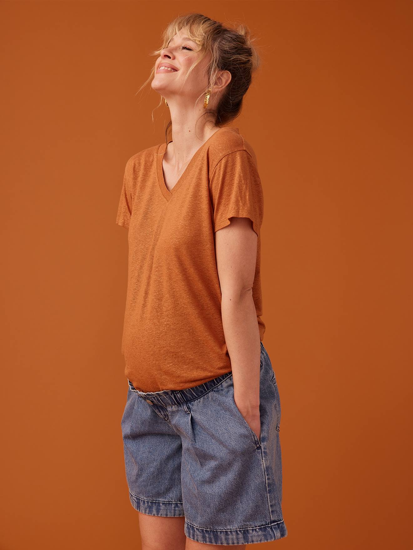 Zwangerschapsshirt met V-hals, iriserend linnen ENVIE DE FRAISE - karamel