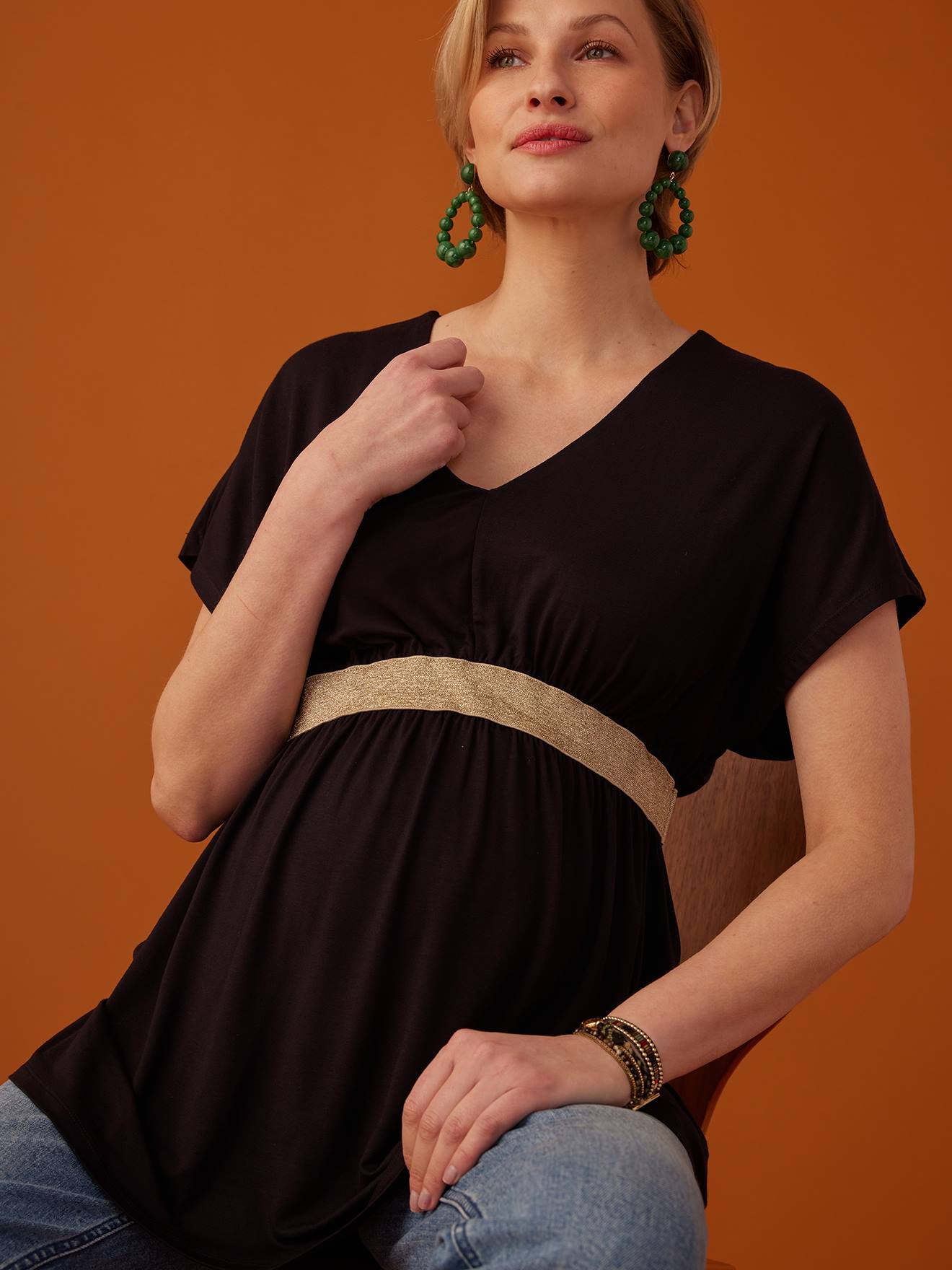 Deze zwangerschapstop, afgewerkt met een gouden elastische tailleband, is een echte must-have. De soepele stof is bijzonder comfortabel om te dragen en de pasvorm geeft hem een zeer vrouwelijke look. Een model dat is ontworpen om de ronde buik van zwangere vrouwen te accentueren, maar die niet te strak om het lichaam heen zit. Je zult dol zijn op de diep uitgesneden halslijn, die van jou een glamoureuze aanstaande moeder maakt en die het voeden na de bevalling makkelijker maakt. Een kledingstuk dat is ontworpen om je tijdens je zwangerschap mooi te laten voelen, te combineren met een broek of rok voor een chique casual stijl.